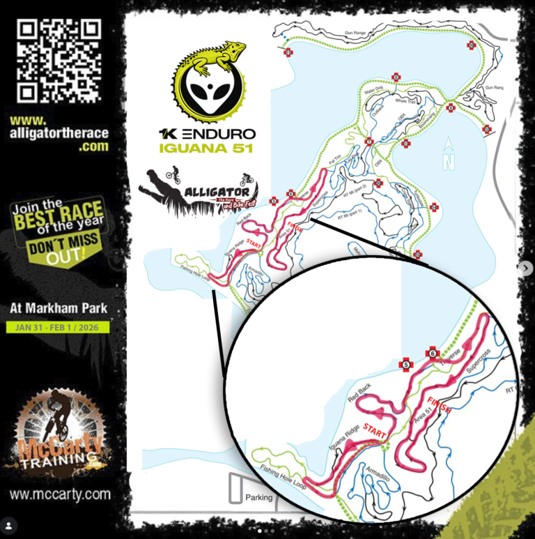 5 Laps (30 miles) of the most technical section of the trails. Intermediate bypasses will be available but will penalize you by adding time to your riding.